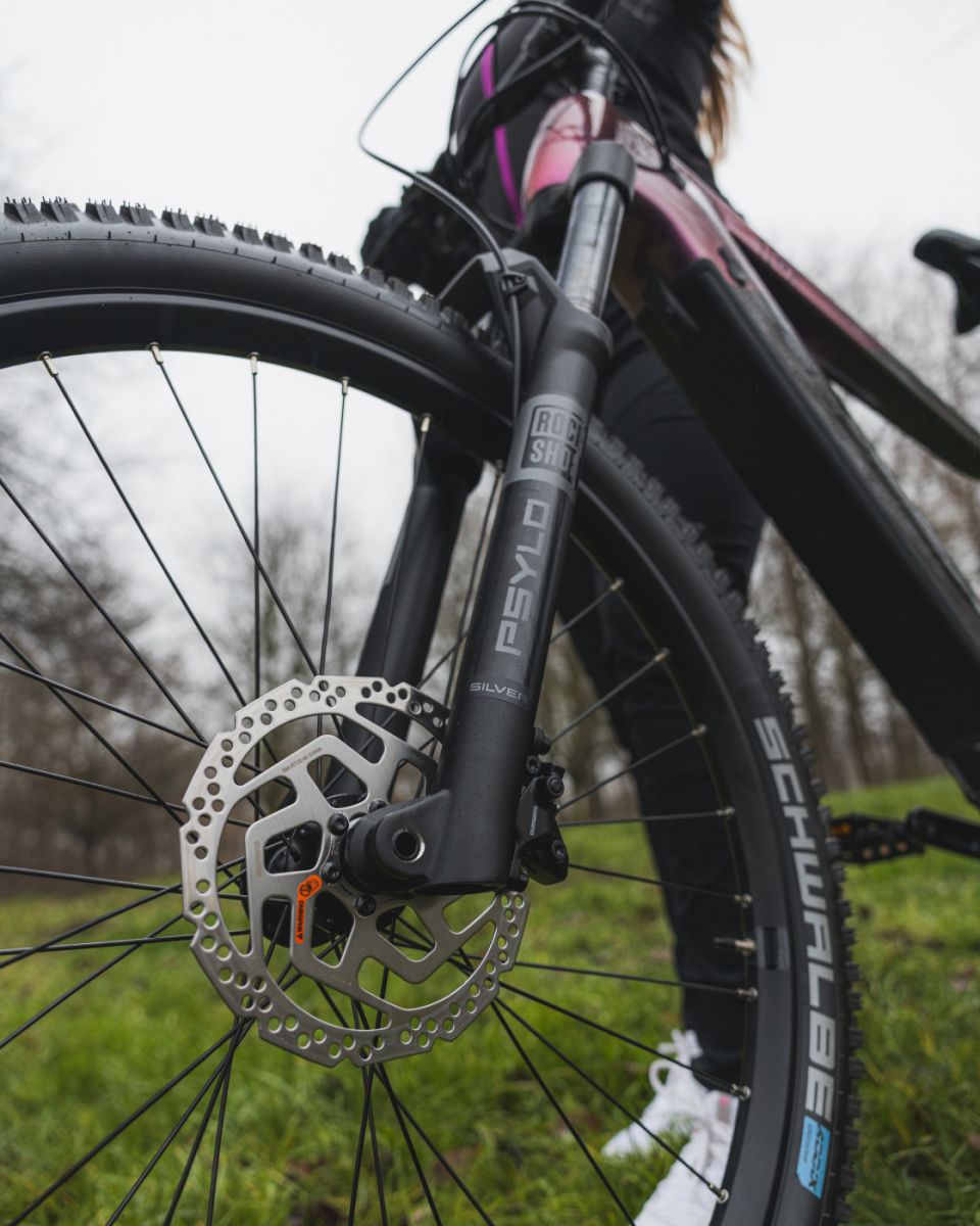 The ROCKSHOX FS Psylo Silver RC Solo Air 27.5" BOOST fork (130 mm travel) effectively absorbs shock and increases riding confidence on uneven surfaces.